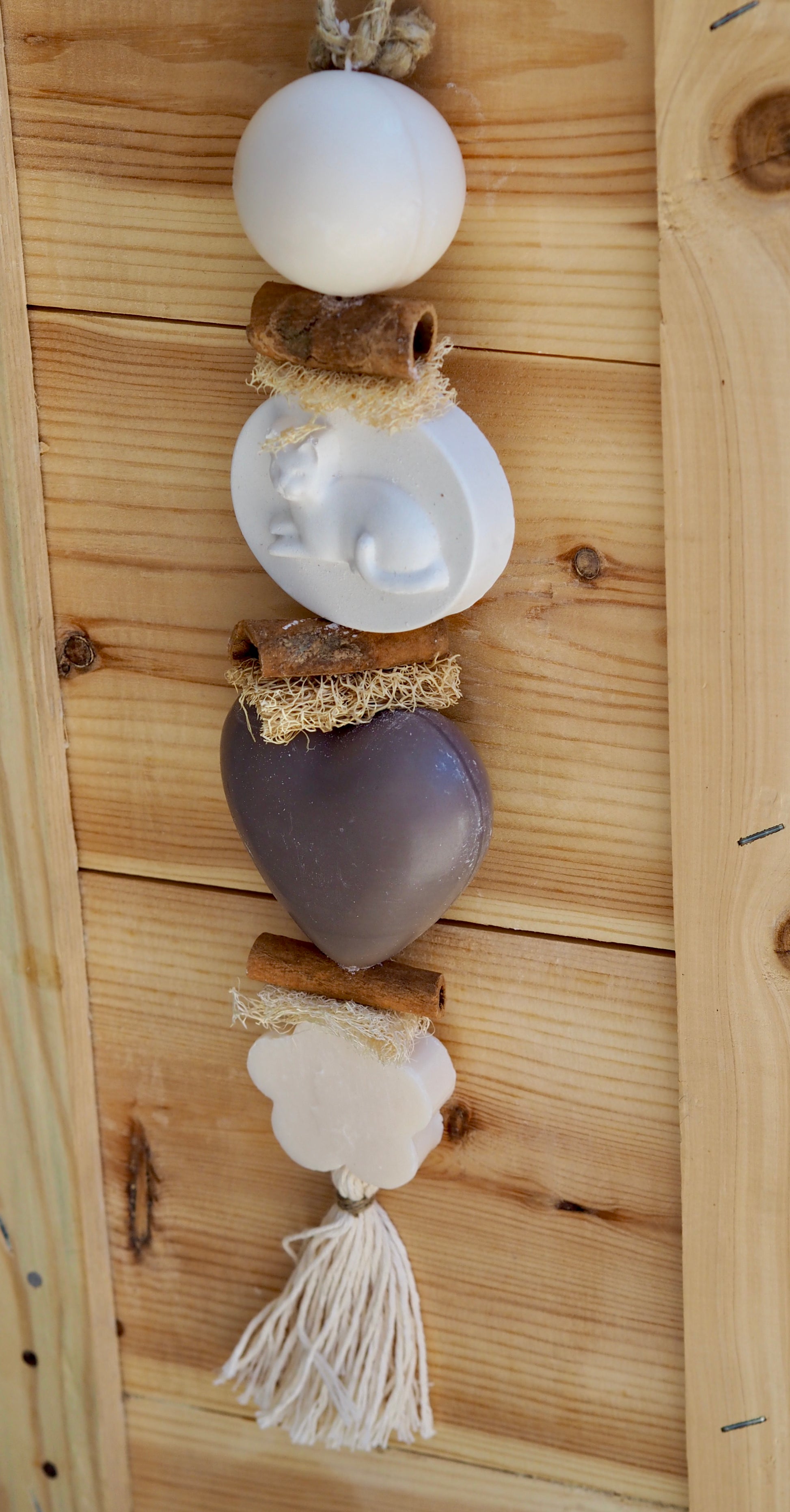 Tresse à savons et plâtre parfumée à suspendre, fabriquée à la main avec sa senteur délicate , elle créera une décoration proche de la nature dans votre intérieur. Grâce à son accroche en chanvre, elle pourra être suspendue pour décorer et parfumer toutes les pièces de la maison. Kitty est ornée de savons et d'éléments naturels comme la loofah, le bois séché et une jolie finition avec un pompon en fibre naturelle