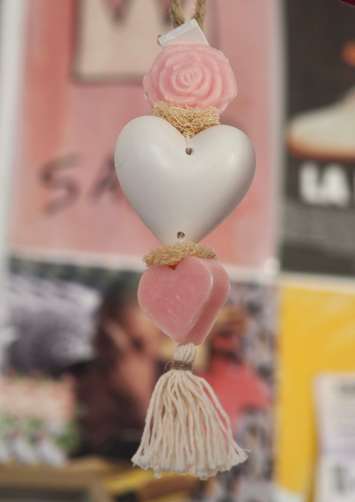 Tresse à savons et plâtre parfumée à suspendre, fabriquée à la main avec sa senteur florale , elle créera une décoration proche de la nature dans votre intérieur. Grâce à son accroche en chanvre, elle pourra être suspendue pour décorer et parfumer toutes les pièces de la maison. Lydia est ornée de savons et d'éléments naturels comme la loofah, le bois séché et une jolie finition avec un pompon en fibre naturelle