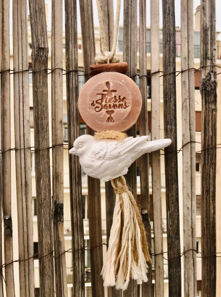 Tresse à savons et plâtre parfumée à suspendre, fabriquée à la main avec sa senteur délicate , elle créera une décoration proche de la nature dans votre intérieur. Grâce à son accroche en chanvre, elle pourra être suspendue pour décorer et parfumer toutes les pièces de la maison. Birdy est ornée d'un platre oiseau et de savons et d'éléments naturels comme la loofah, le bois séché et une jolie finition avec un pompon en fibre naturelle